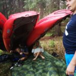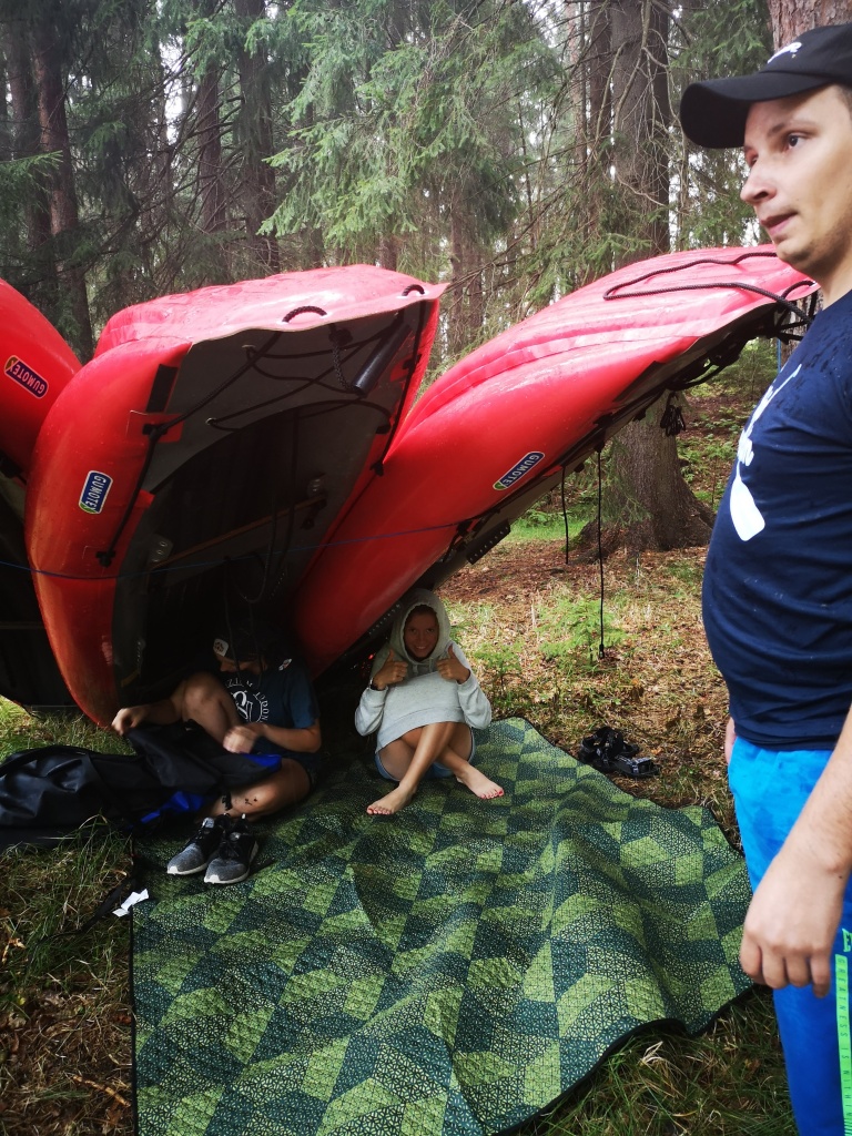 V úterý ráno, po sbalení tábořiště jsme my řidiči přesunuli naše přibližovadla do Majdaleny, kam jsme chtěli ten den doplout. Po návratu vlakem zpět jsme začali s proškolením ovládání člunů, proškolením bezpečnosti atd. Zatím vody ještě bylo jakž takž. Postupně však vody ubývalo a bylo i několik míst, která jsme museli přenášet. Nicméně nám to náladu nezkazilo a dokonce nás nesrazila ani průtrž mračen. Která se nad námi prohnala a která nás na chvíli zahnala pod imrovizovany přístřešek ze člunů. Do Majdaleny jsme dorazili bez úhony, jenom trochu unaveni. Následovala svačina/oběd vybalení tábora a podvečerní bojová hra, při které jsme v blízkém, dalekém a nejdalečejším okolí hledali cokoli co hoří. Samosebou jsme pátrali po volně ležícím klestí. Kácet cokoli jsme odmítali. Snaha se však vyplatila a večer jsme se hřáli u táboráku.