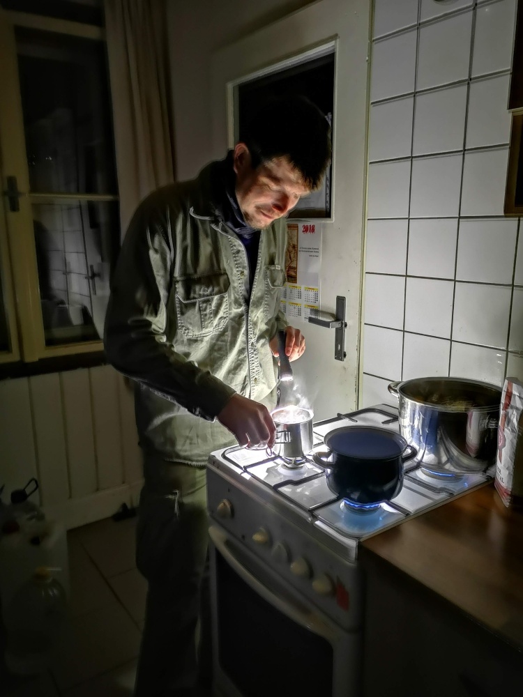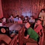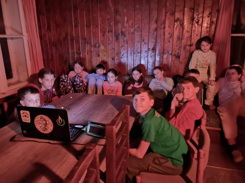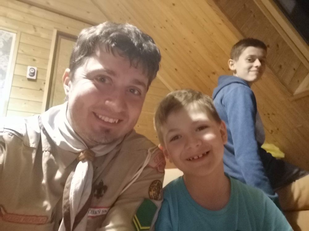 Povečeřeli jsme ze svých zásob nesených na zádech, proběhla nutná hygiena a večer se v skromných (zejména po stránce elektrické energie) promítala úžasná a hlavně skautská pohádka „Vzhůru do oblak.“ Potom už jen rychlý nástup a večerka.