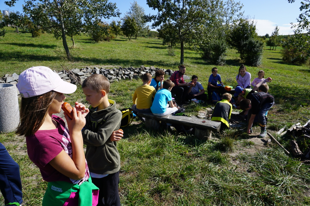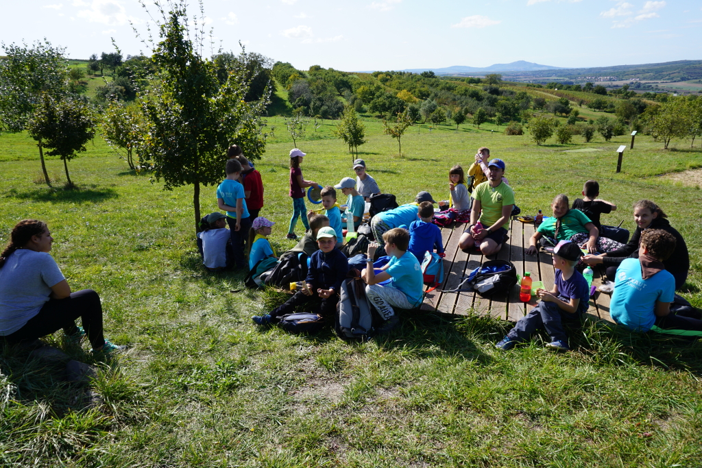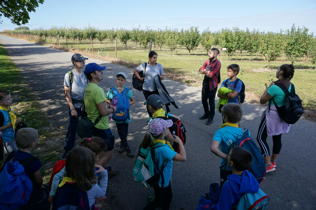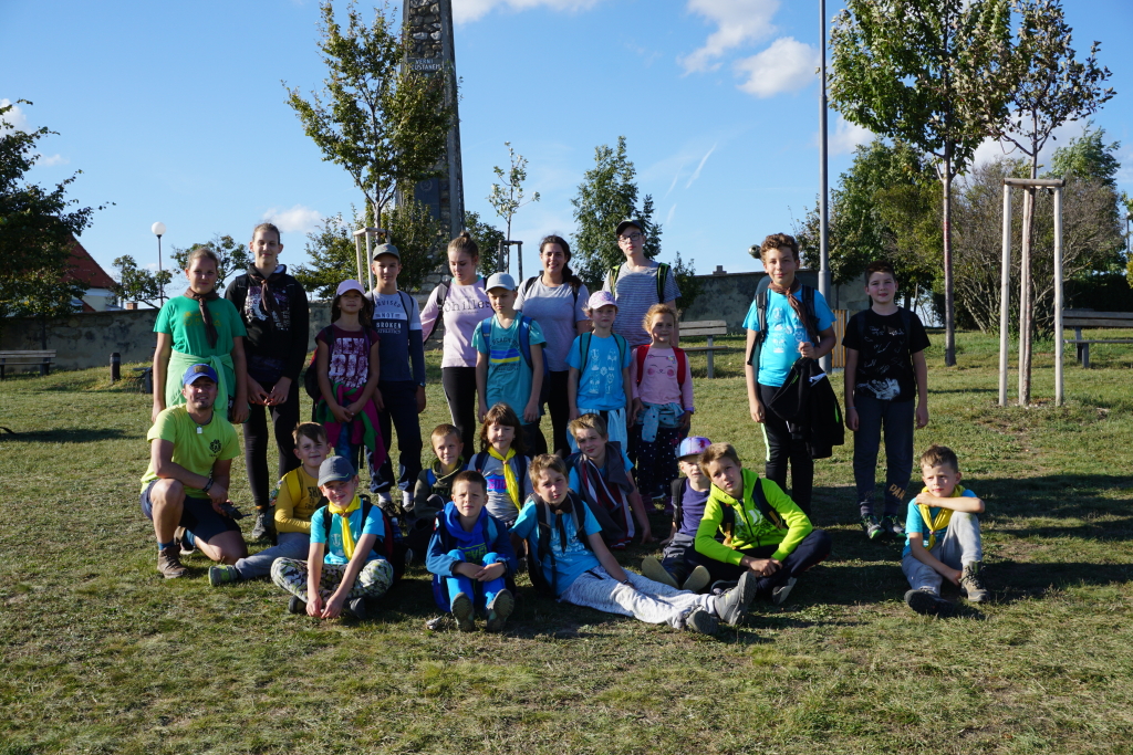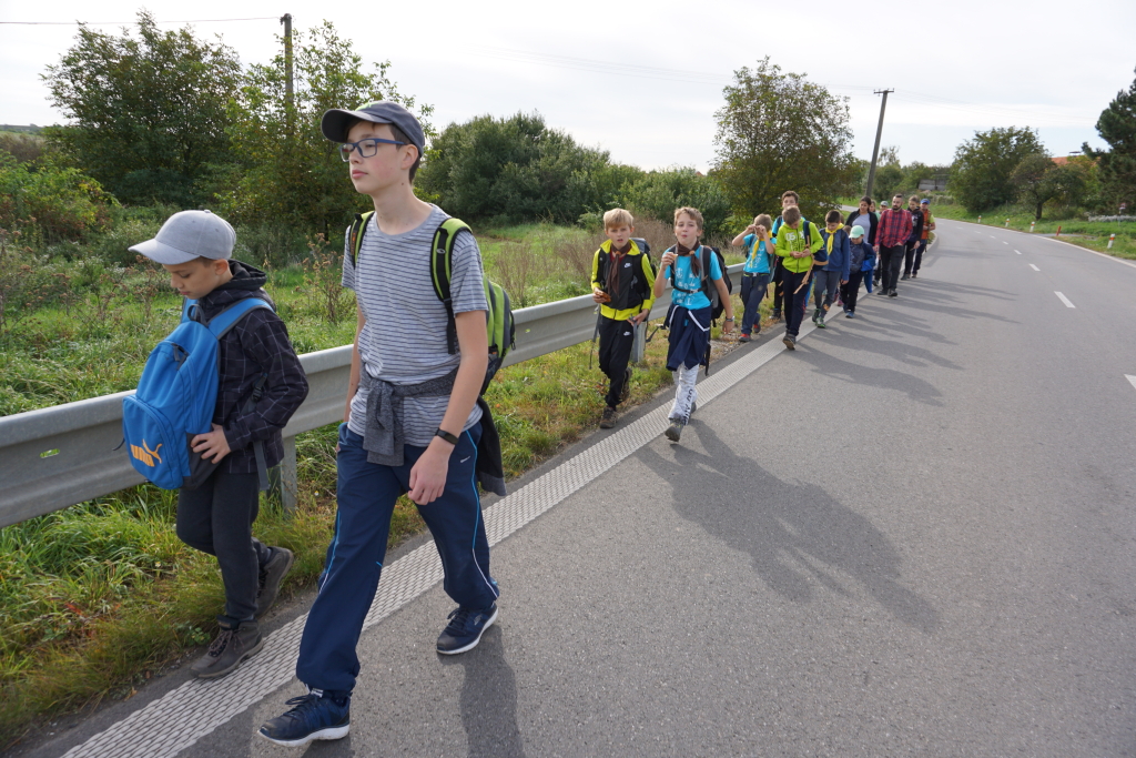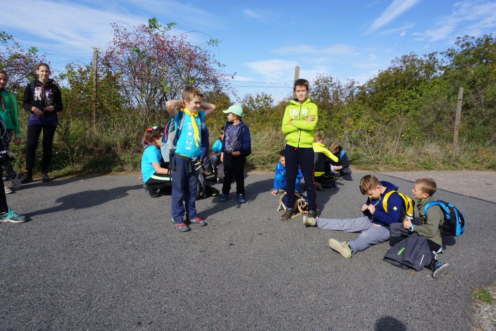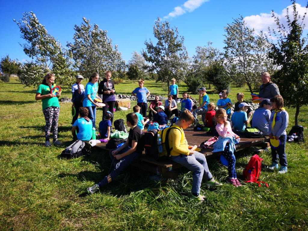 Druhá letošní výprava proběhla v režii vrbeckých skautů v neděli 29.9. V 9:00 jsme se sešli na kraji Vrbice a vyrazili směr Čejkovice. Cestou jsme si zahráli hry Klíště a Kolemjdoucí. Klíště – kolíčky s určitým úkolem a děti si je během cesty tajně předávají. Náhodně se během cesty zastavuje a zjišťuje, kdo má zrovna klíště, ten poté plní zadaný úkol, např. zazpívat písničku. Při hře Kolemjdoucí si vybraní hráči musí zapamatovat, co měl kolemjdoucí za oblečení, popsat ho, vymyslet mu jméno, tipnout si odkud a kam jde. Tyto hry nám zabraly více času, než jsme očekávali, a tak jsme se na kraj Čejkovic dostali až po desáté hodině. Tam jsme se sešli s čejkovskými skauty a vydali se do Kobylí na discgolf. Šli jsme kousek po hlavní směr Čejč, ale stálo to za to, děti byly vzorné a následná cesta mezi sady je moc pěkná.