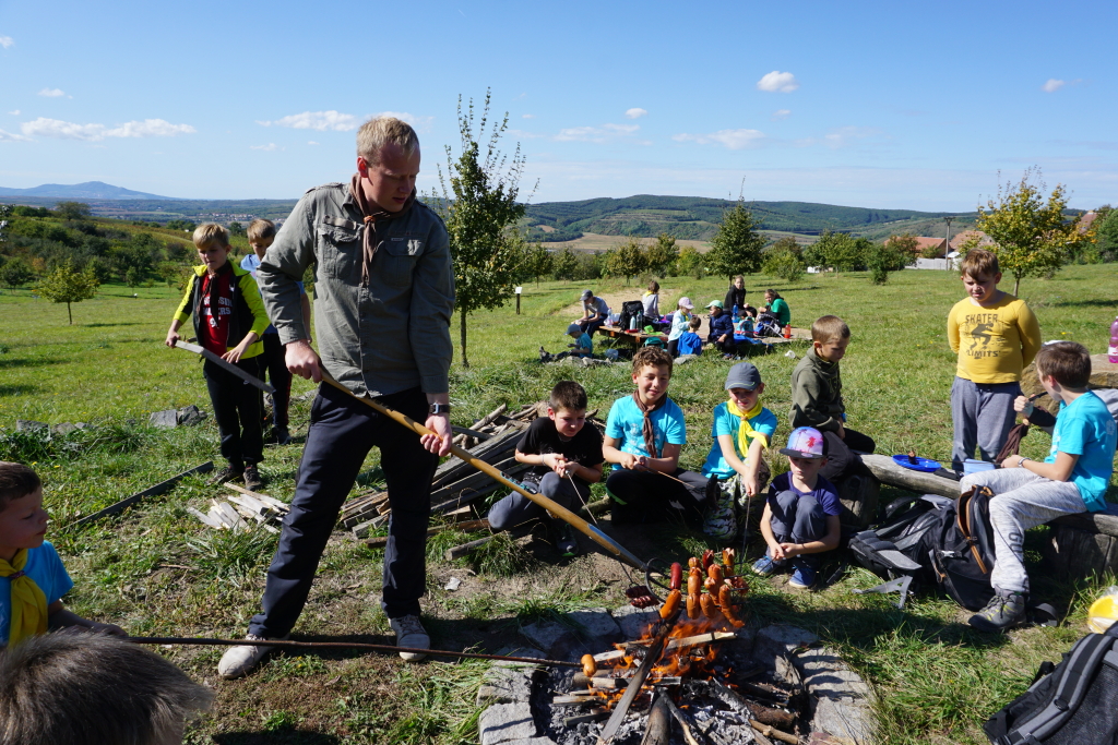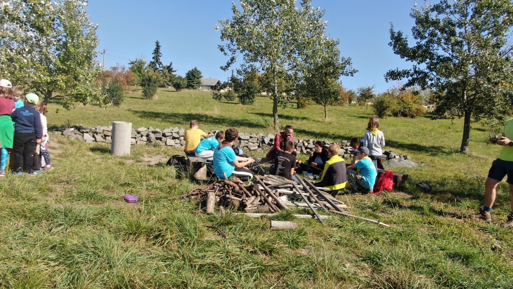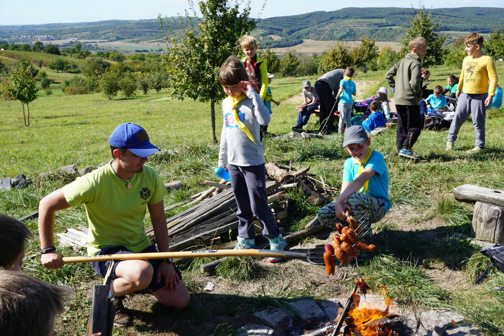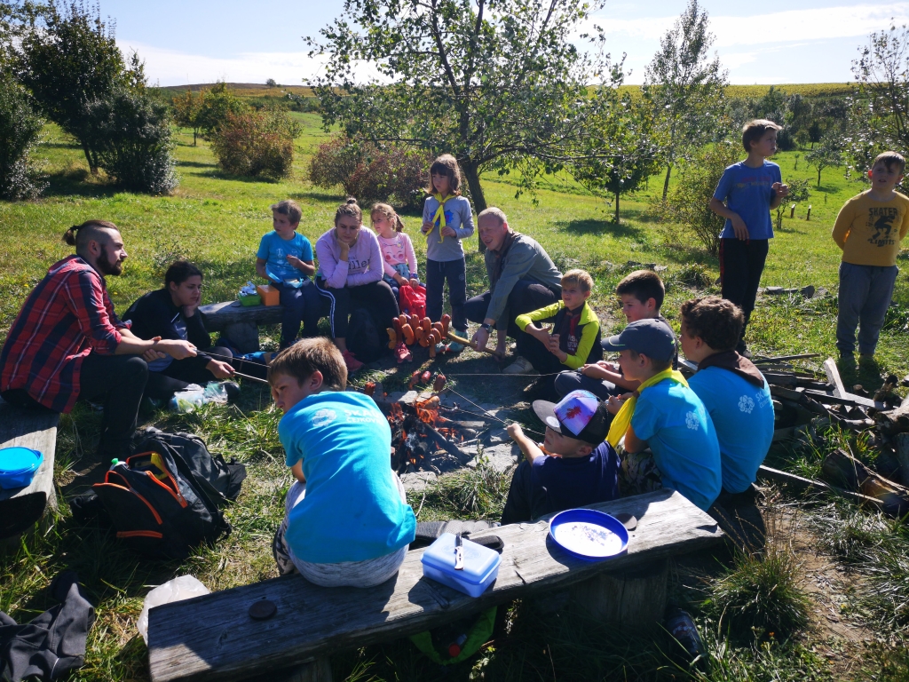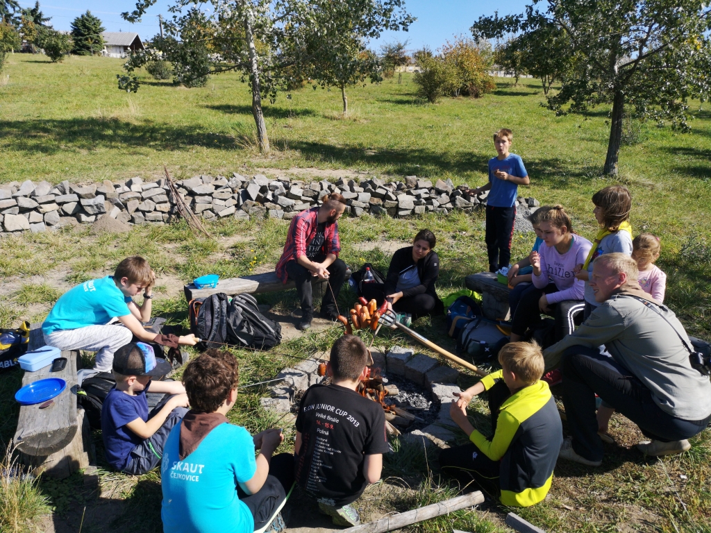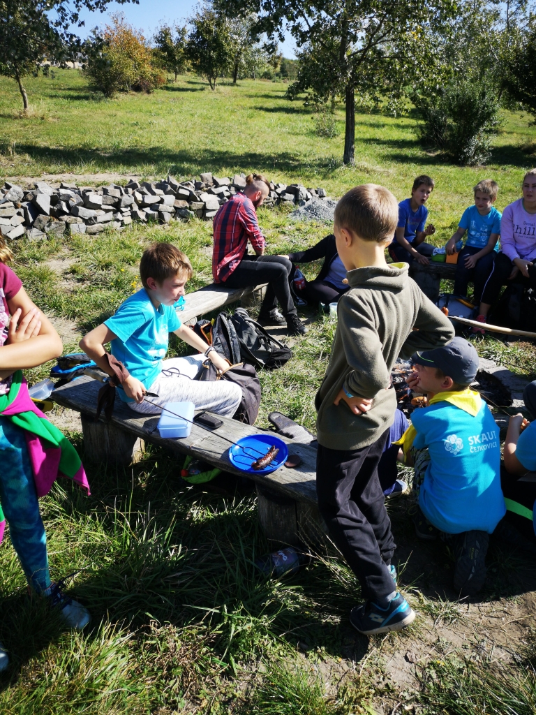 Při svačině se k nám připojily i děti, které se nemohly účastnit od začátku, jelikož byly v kostele. Po svačině jsme hráli hru Blázinec, kdy jeden v roli doktora ostatním podává otázky a hádá jakou mají diagnózu. Kolem jedné jsme dorazili na místo, kde jsme rozdělali oheň a opekli si špekáčky.