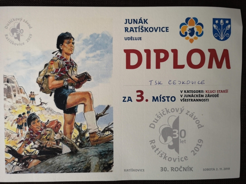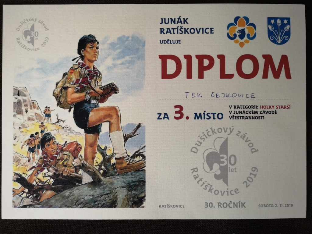 Dušičkový závod Už třicátých rokem se konal Bigglesův memoriál, neboli Dušičkový závod v Ratíškovicích na počest všem zemřelým skautům. Ani my, skauti z Čejkovic, jsme tam samozřejmě nemohli chybět. Dojeli jsme na klubovnu v Ratíškovicích už o den dříve, aby jsme si prodloužili dobrodružství a díky různým hrám jsme prozkoumali okolní les. Ráno hned po snídani pak mohl začít samotný závod. Rozdělili jsme se na skupinky – hlídky, které byly postupně vysílány do lesa po označené cestě. Naši skauti se poprali s nejrůznějšími stanovištěmi, jako byly například rozdělávání ohně, střílení ze vzduchovky, znalost skautského zákona a idey nebo lezení po lanech. Nic, co by naši skauti nezvládli. Po osmnácti stanovištích plných snažení a přemýšlení postupně doběhli do cíle. Naše družinky starších holek a starších kluků si odvezli dvě třetí místa a nové zkušenosti na další ročník.