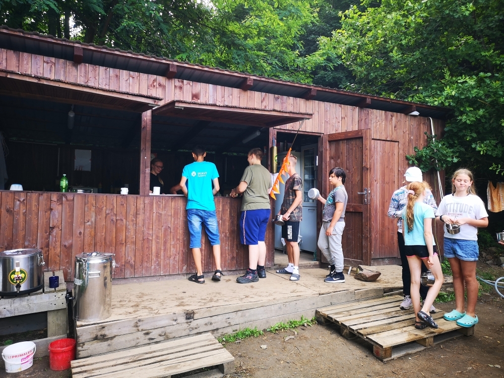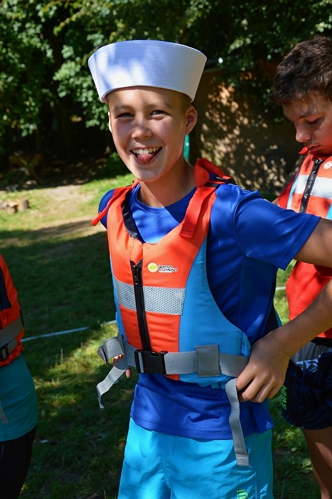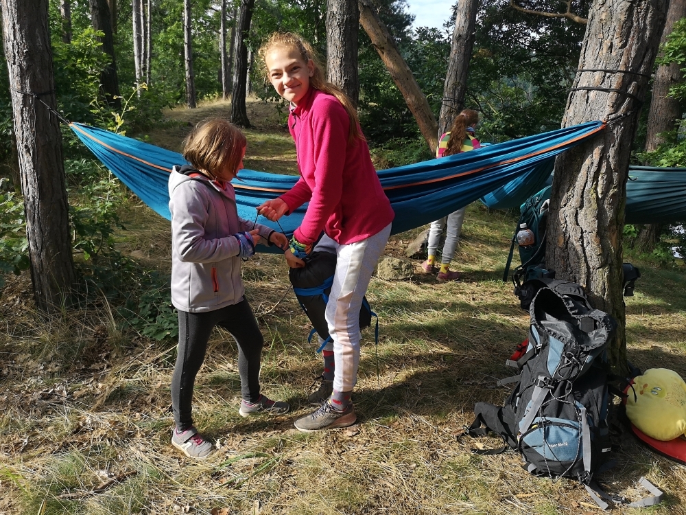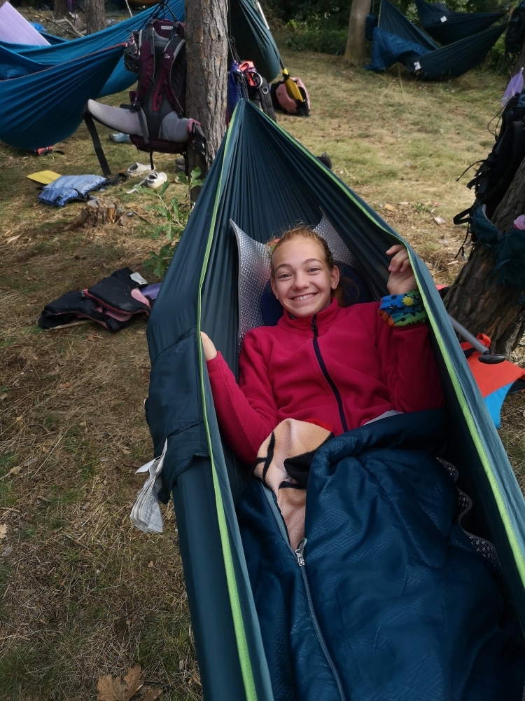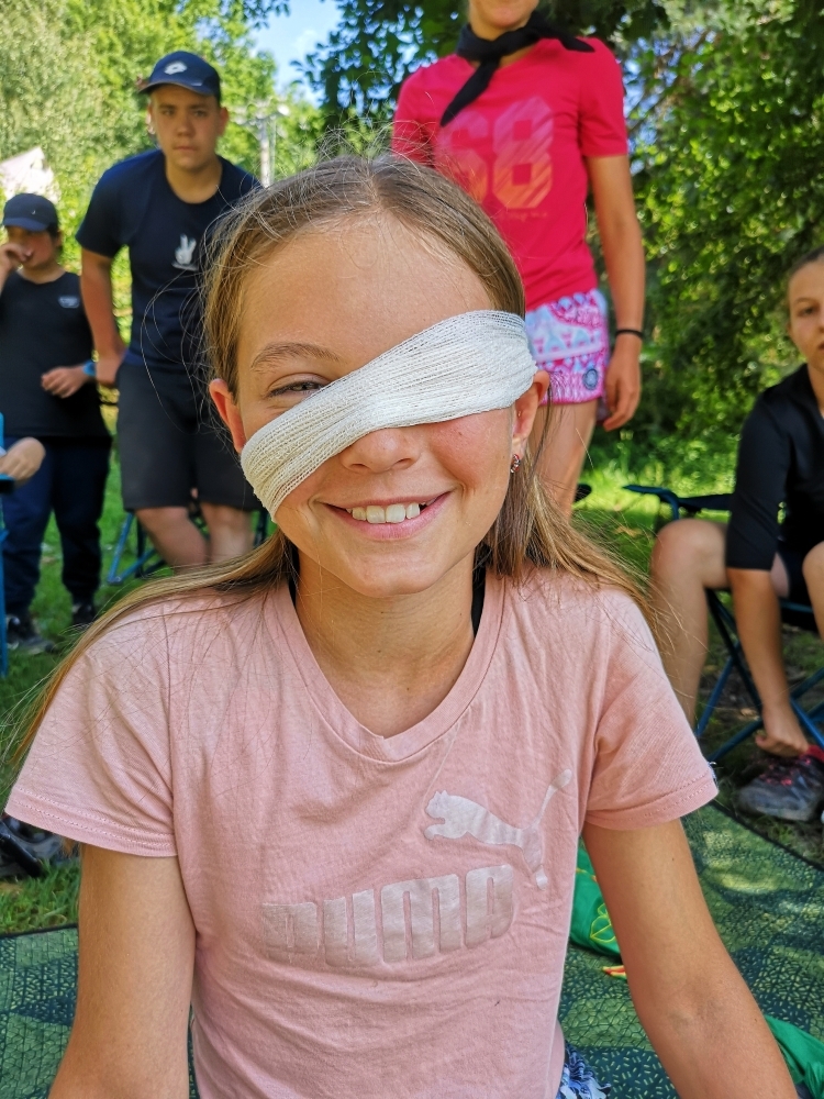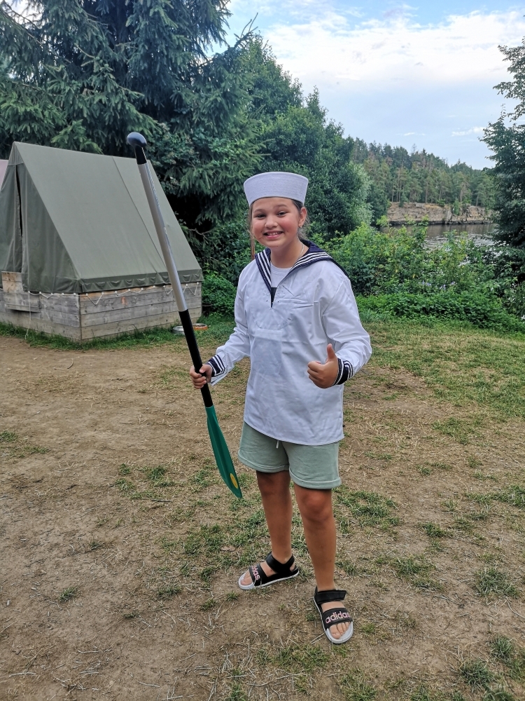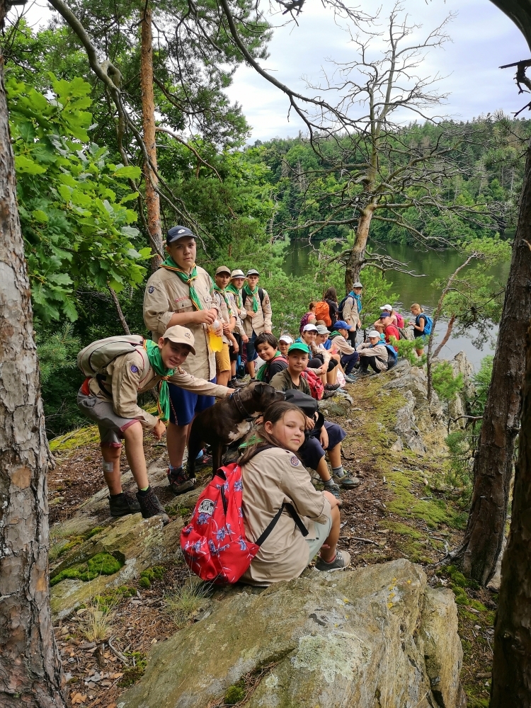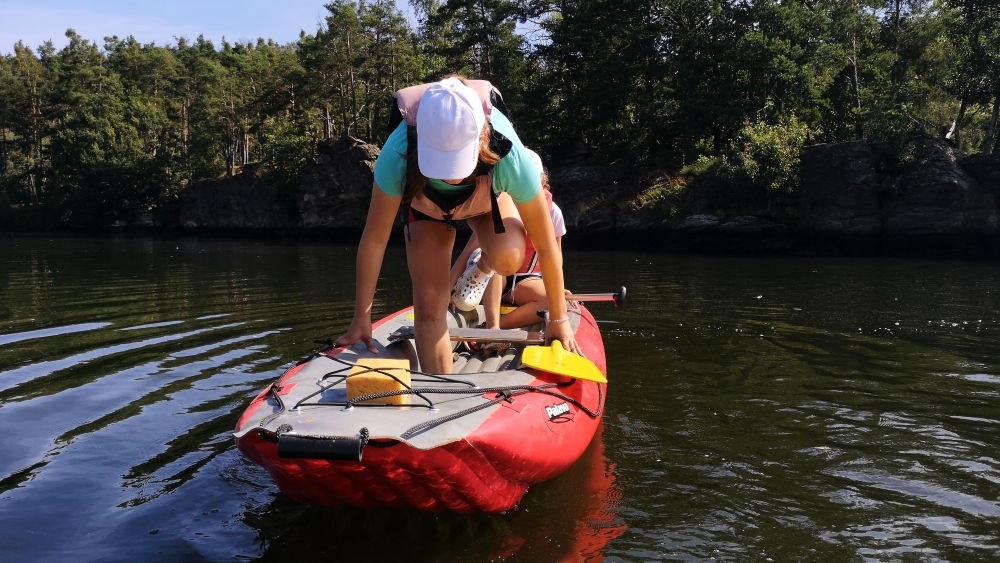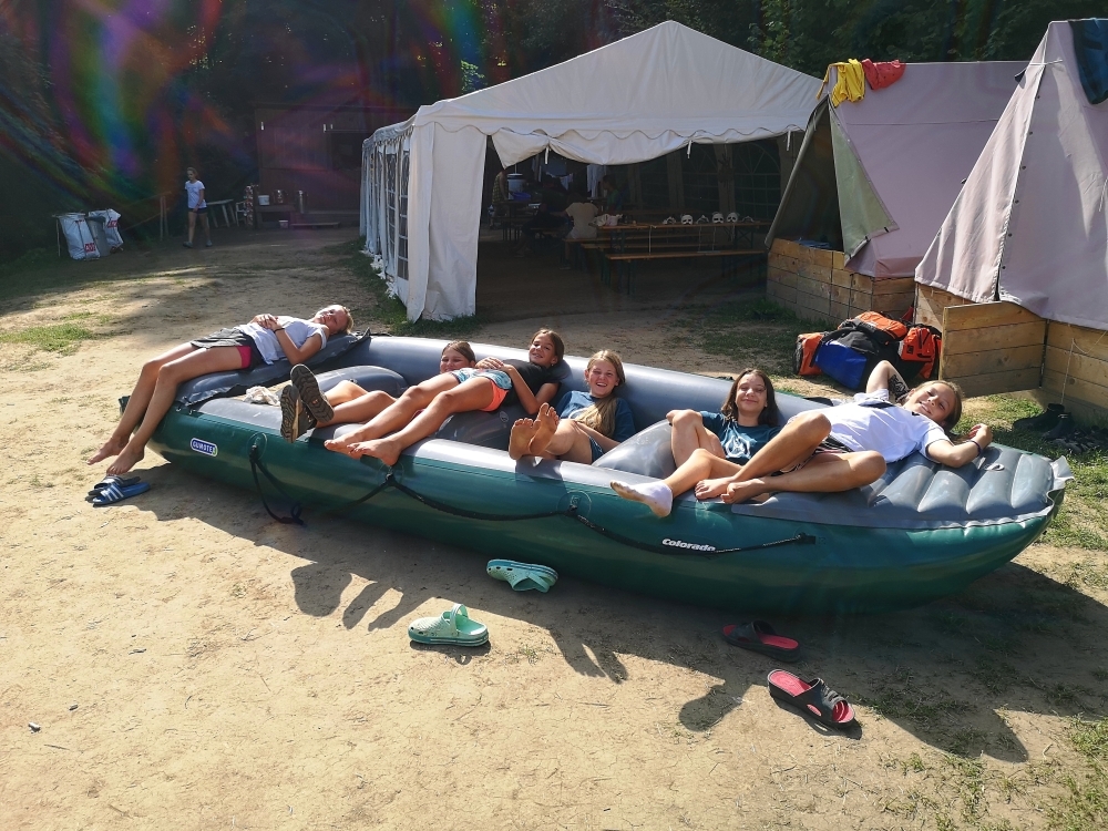 Jeden den jsme dokonce přespávali na pustém ostrově, kam jsme dopluli večer na lodích a spali mezi stromy v hamakách. Další dny jsme se věnovali odborkám (něco jak bobříci) jako např. záchranář, vodák, obřadník, trosečník, zdravotník a další. Každý si mohl vyzkoušet například volání sanitky. Nebo převracení raftu, který se za normální situace skoro nedá převrátit. Ale zvládl to každý! Byli jsme opravdu pyšní.. Ale jedním z nejtěžších úkolů si prošel rover Honza. Ten musel strávit dva dny mimo tábořiště jen s tím, co měl po kapsách, ale velkou skautskou výzvu zvládl bravurně. Vzhledem k situaci ohledně koronaviru probíhal tábor s několika omezeními. Tak jako minulý rok, bylo nutné několikrát denně dezinfikovat převážně jídelny, toalety i další prostory.