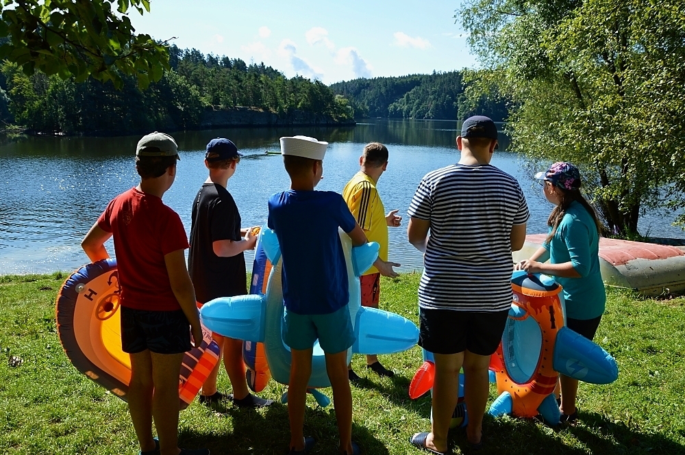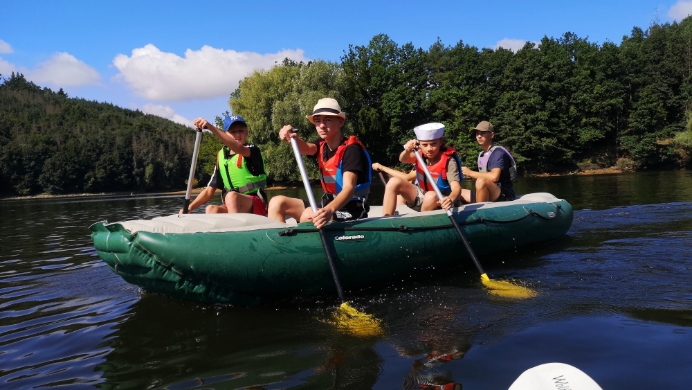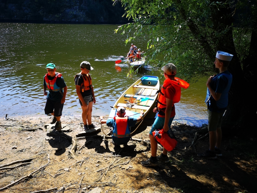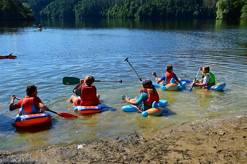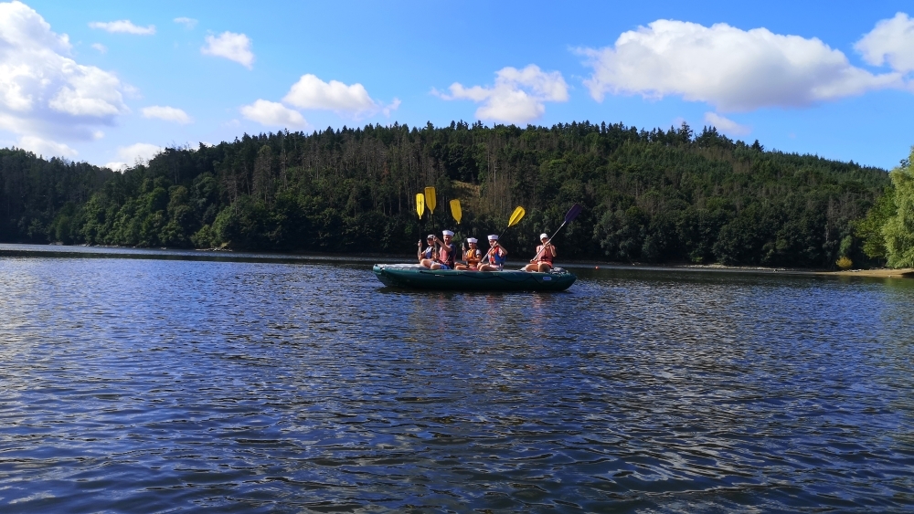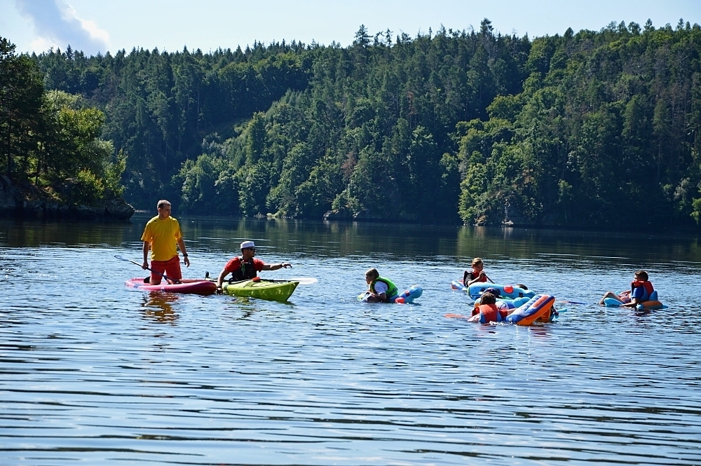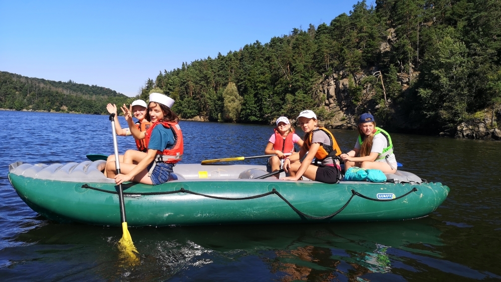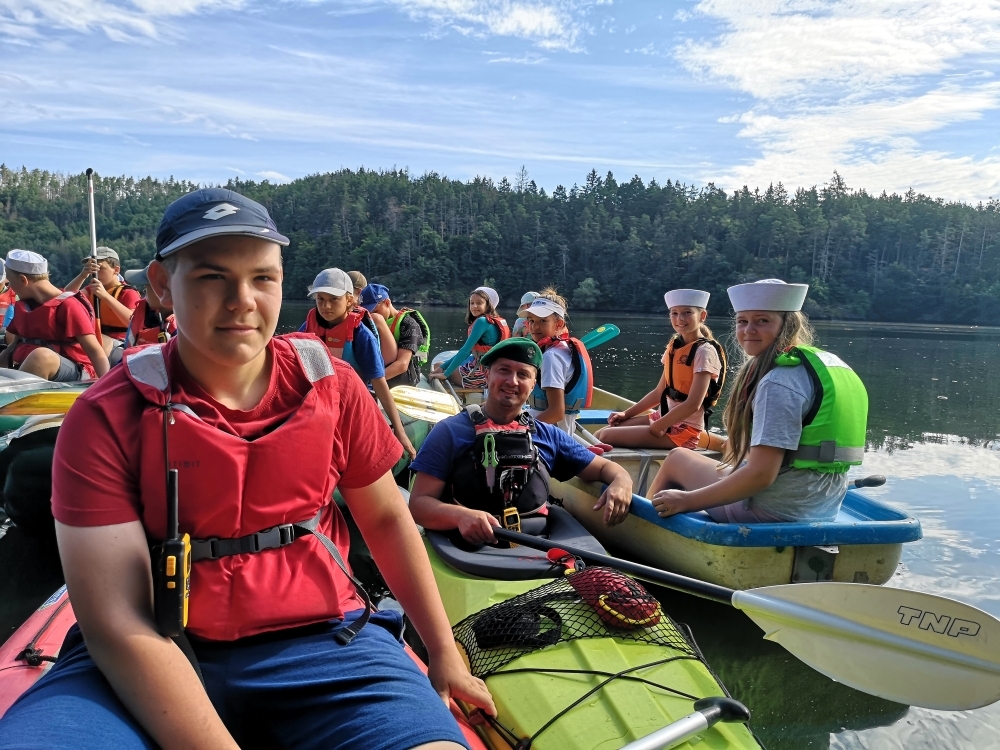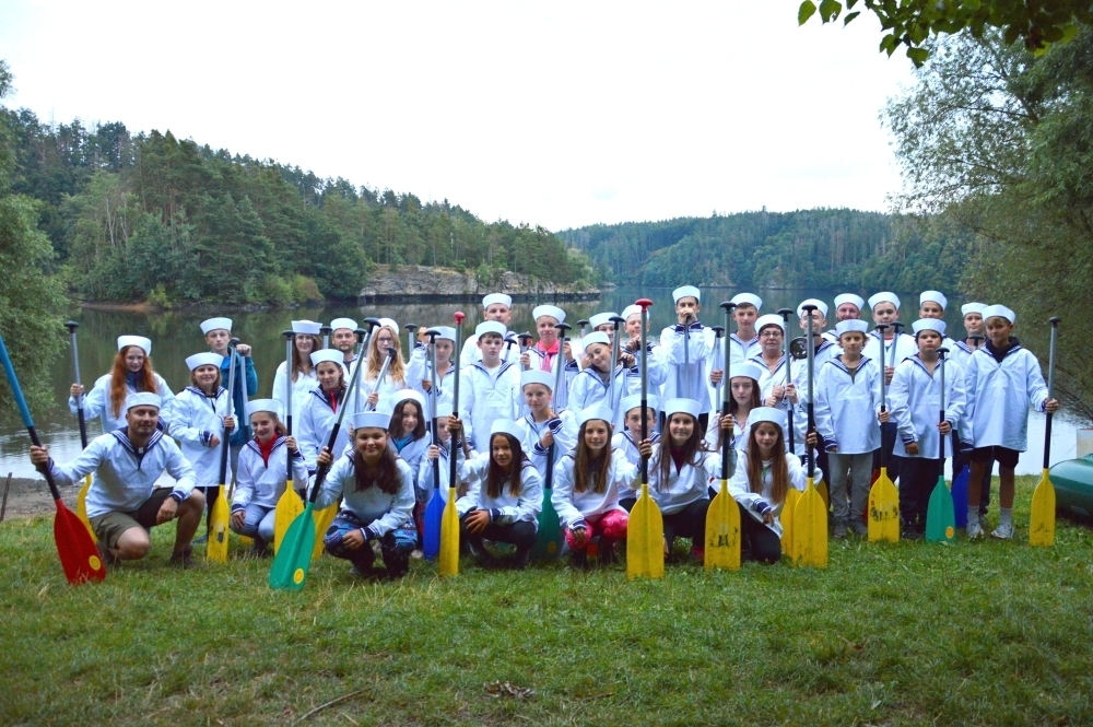 Letos nás nečekal jen jeden tábor, ale hned dva, souběžně běžící. Vodácký se konal na Dalešické přehradě. Tento tábor byl určený hlavně starším dětem. Čekalo nás nové neprozkoumané tábořiště, se kterým jsme se prvních pár dnů seznamovali stejně jako s ovládáním lodí. Děti byly rozděleny do tří flotil, z toho každá měla dva kormidelníky. Čili každá flotila měla dvě lodě a dvě posádky. Měli jsme tedy celkem šest lodí a na dalších pluli naši obratní vedoucí.