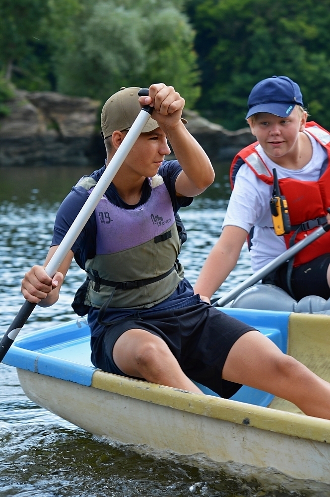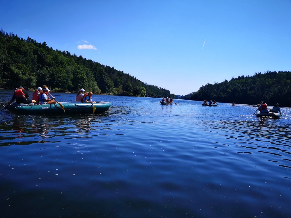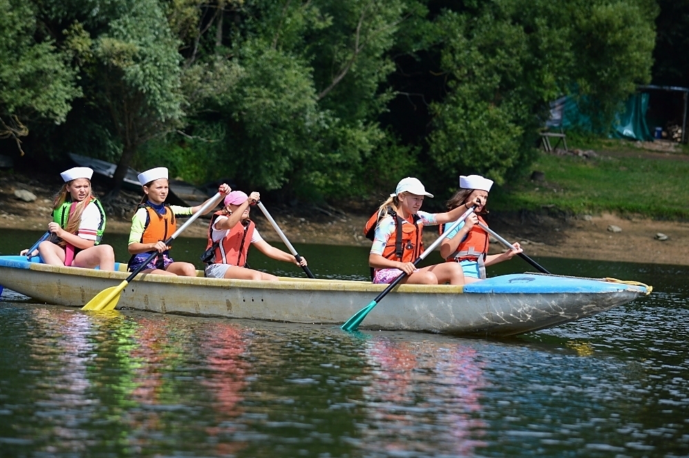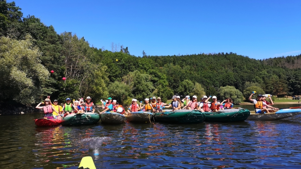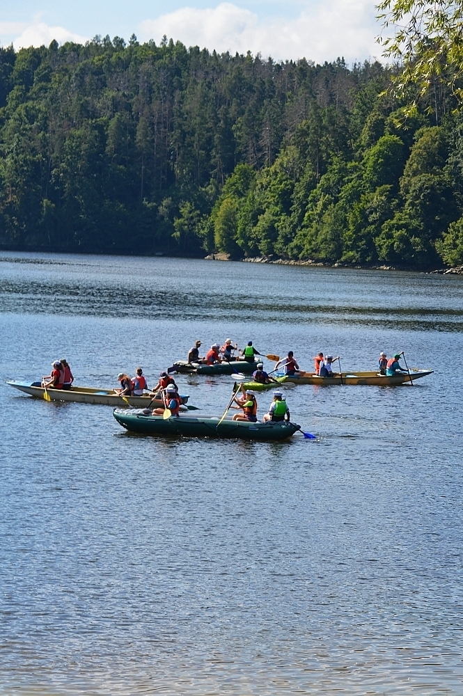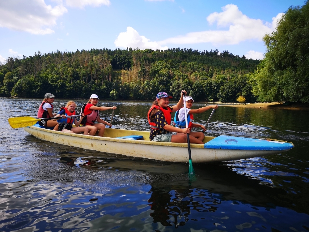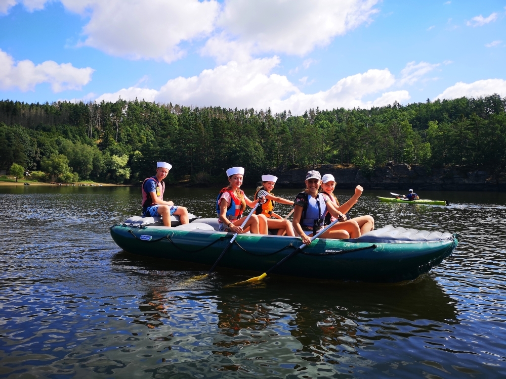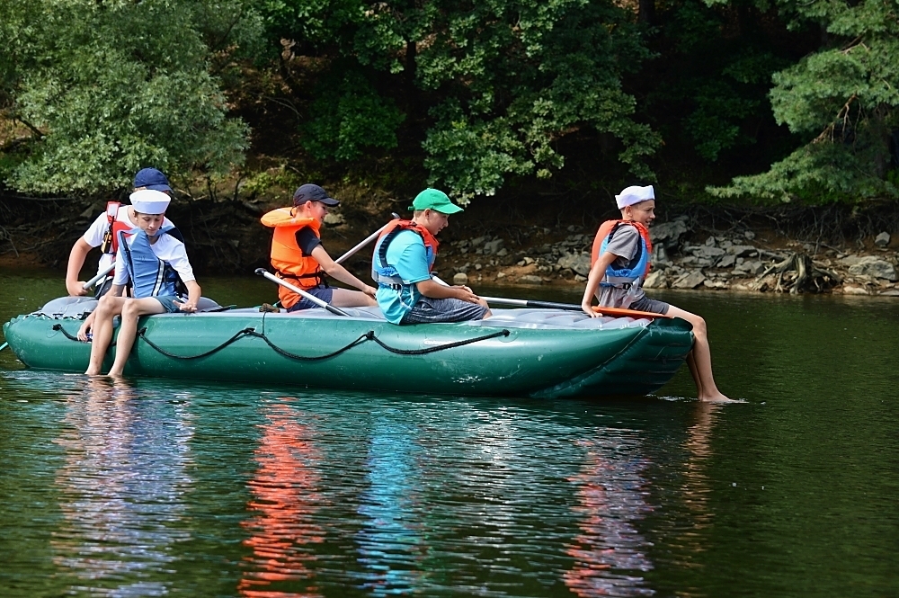 Letos nás nečekal jen jeden tábor, ale hned dva, souběžně běžící. Vodácký se konal na Dalešické přehradě. Tento tábor byl určený hlavně starším dětem. Čekalo nás nové neprozkoumané tábořiště, se kterým jsme se prvních pár dnů seznamovali stejně jako s ovládáním lodí. Děti byly rozděleny do tří flotil, z toho každá měla dva kormidelníky. Čili každá flotila měla dvě lodě a dvě posádky. Měli jsme tedy celkem šest lodí a na dalších pluli naši obratní vedoucí.