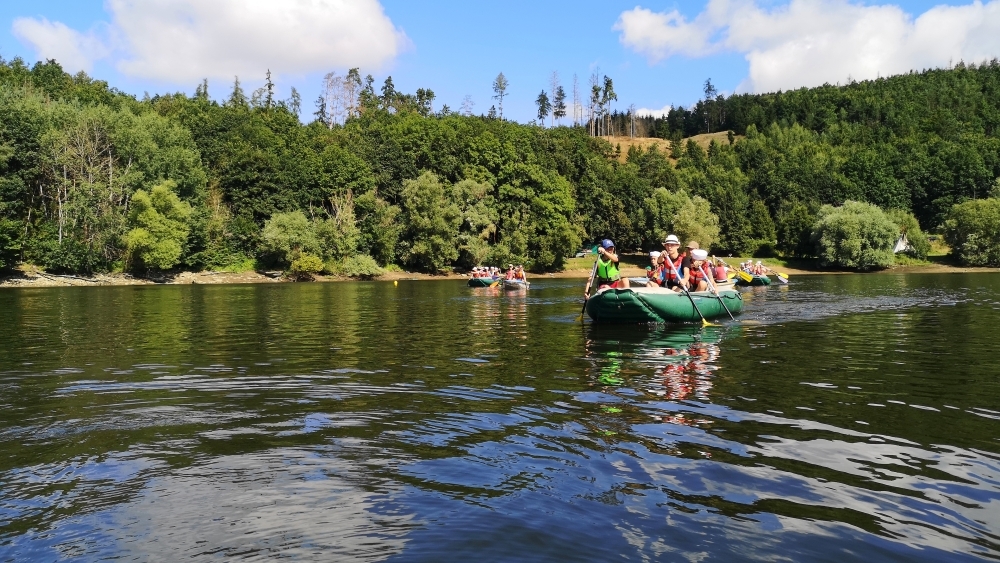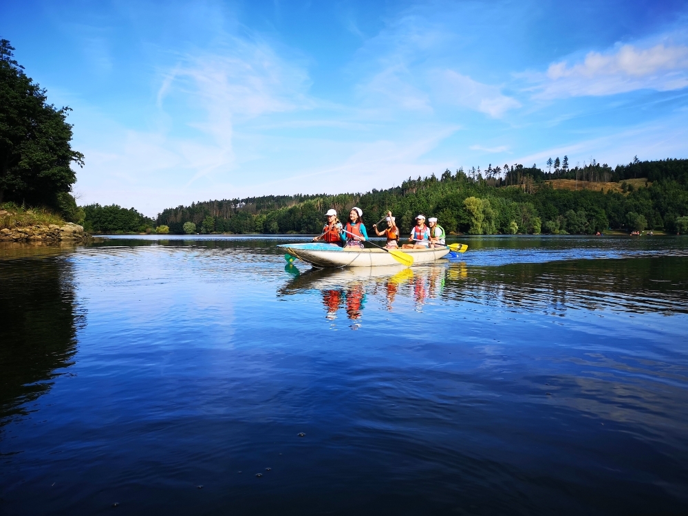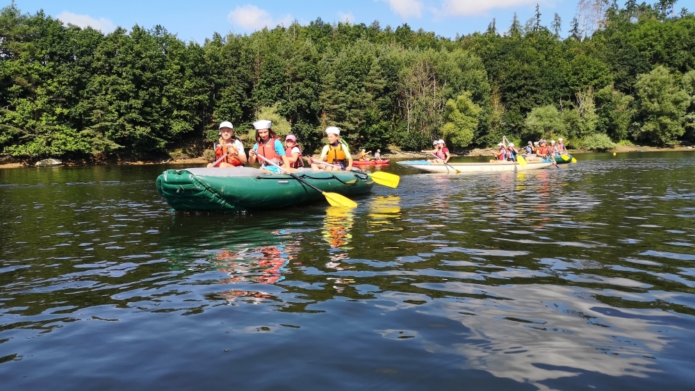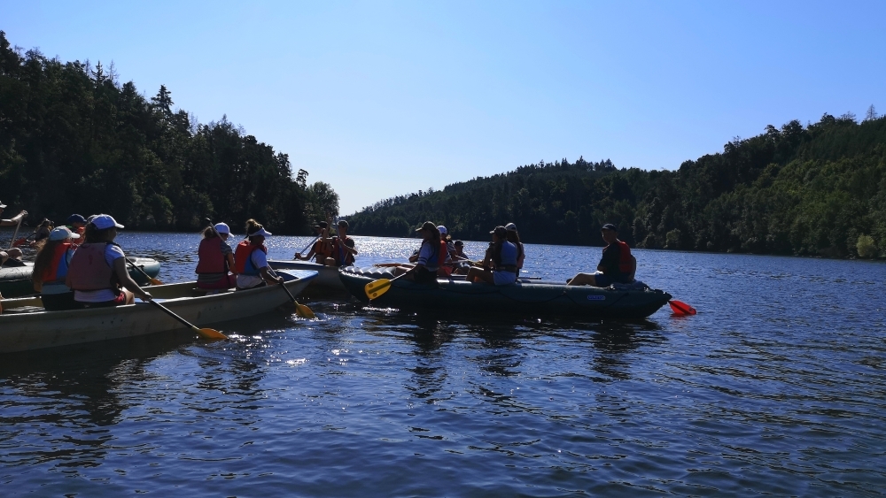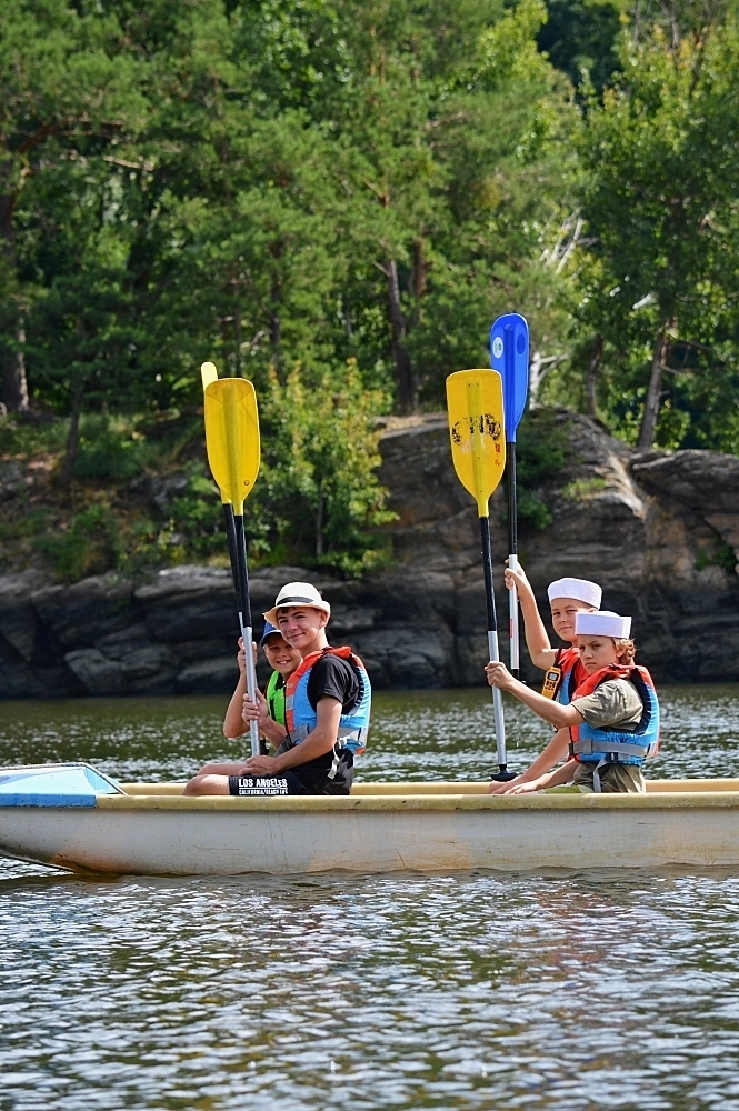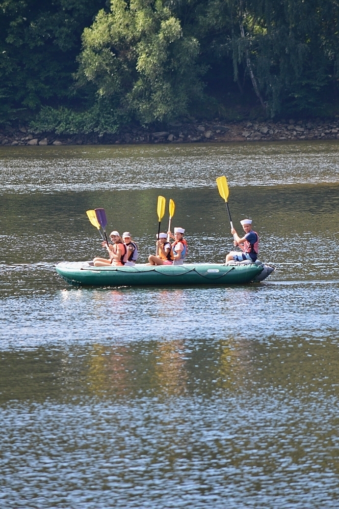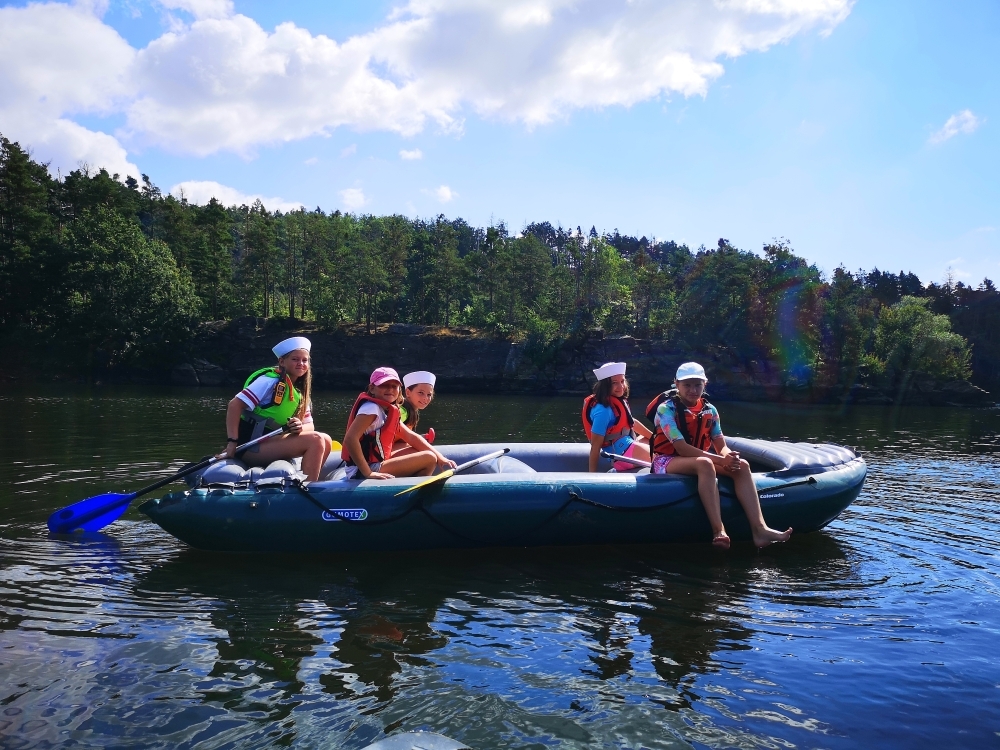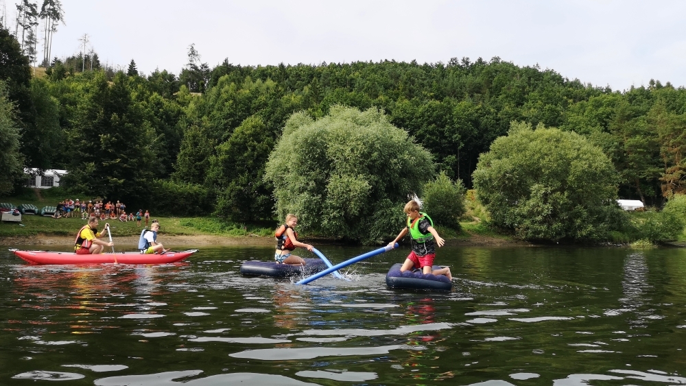 Letos nás nečekal jen jeden tábor, ale hned dva, souběžně běžící. Vodácký se konal na Dalešické přehradě. Tento tábor byl určený hlavně starším dětem. Čekalo nás nové neprozkoumané tábořiště, se kterým jsme se prvních pár dnů seznamovali stejně jako s ovládáním lodí. Děti byly rozděleny do tří flotil, z toho každá měla dva kormidelníky. Čili každá flotila měla dvě lodě a dvě posádky. Měli jsme tedy celkem šest lodí a na dalších pluli naši obratní vedoucí.