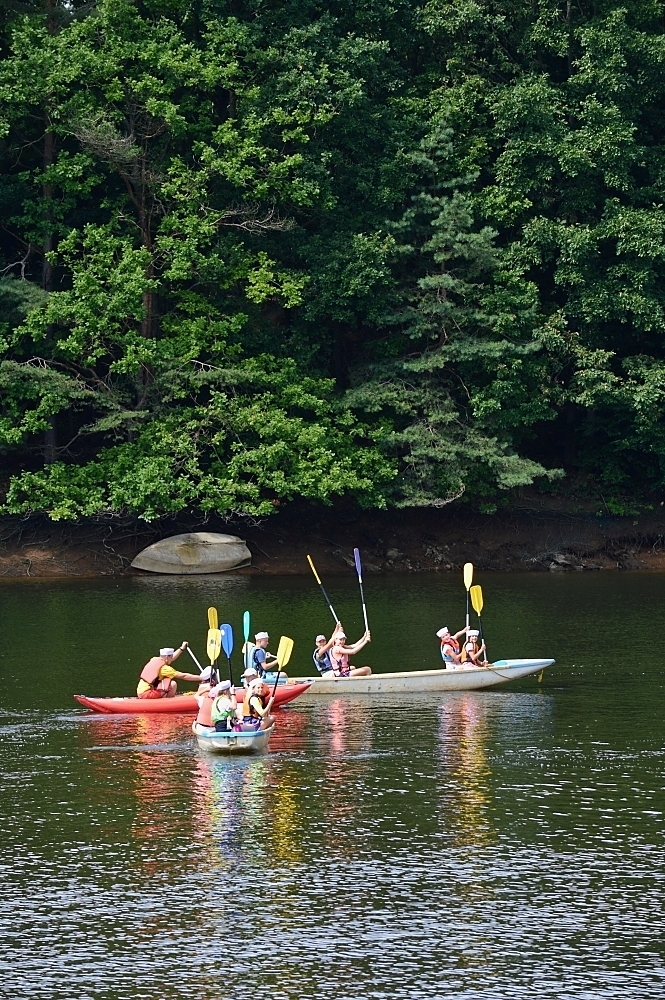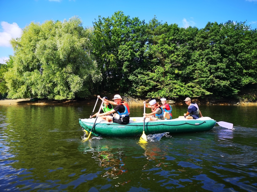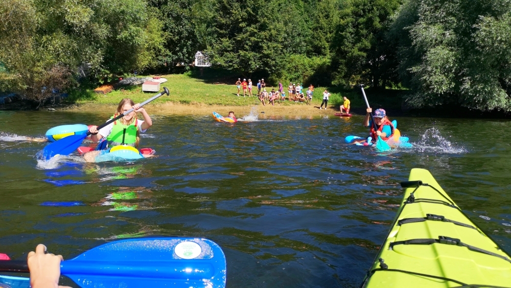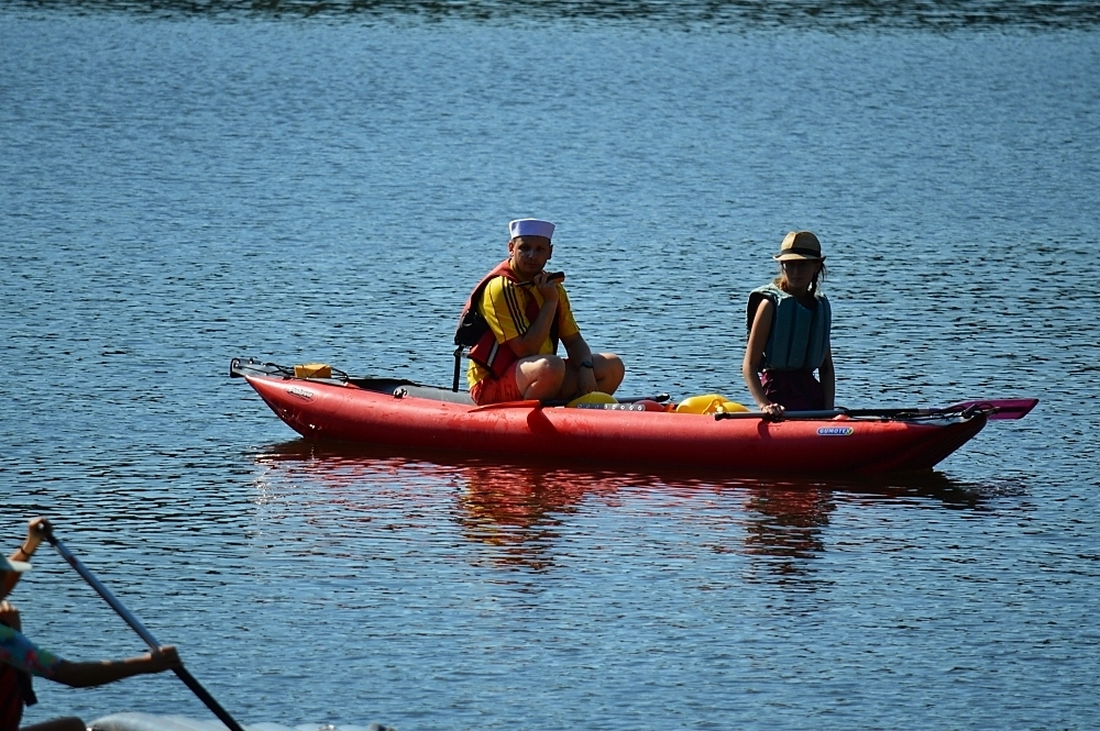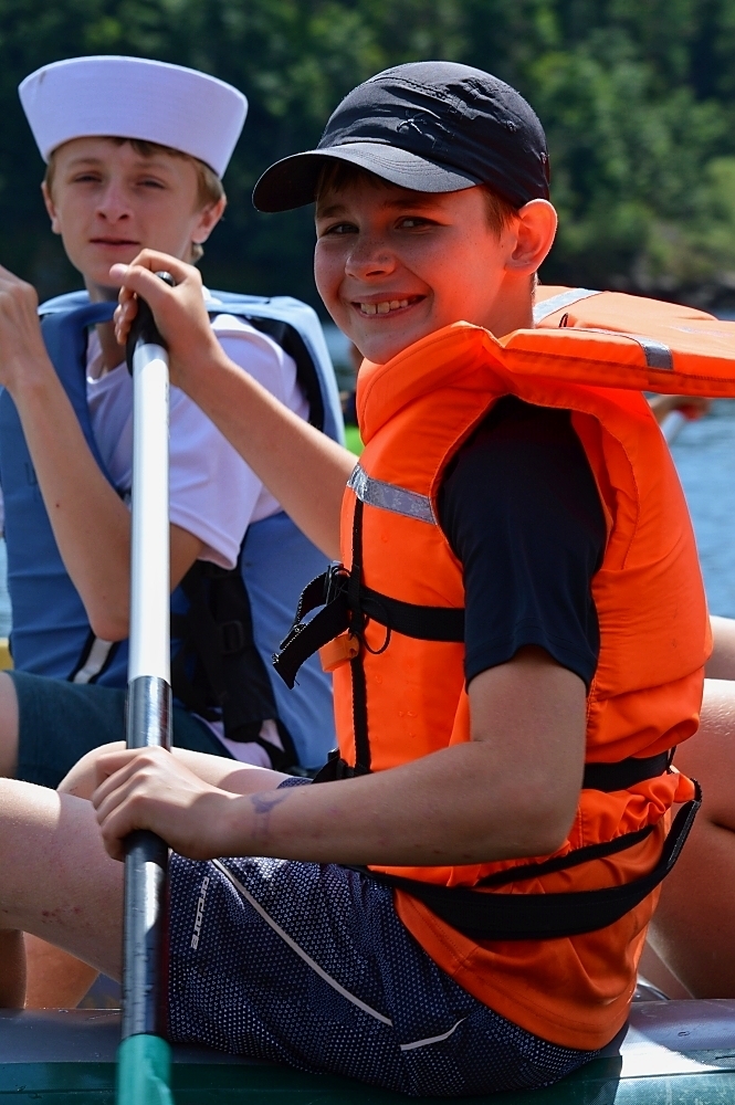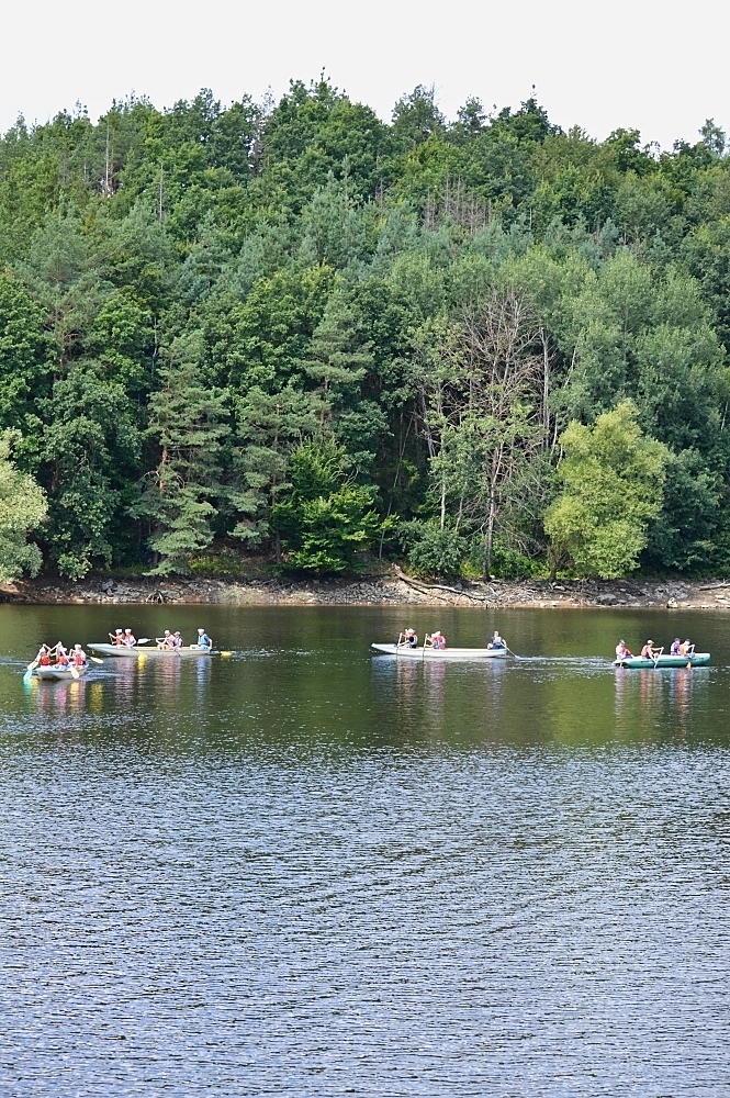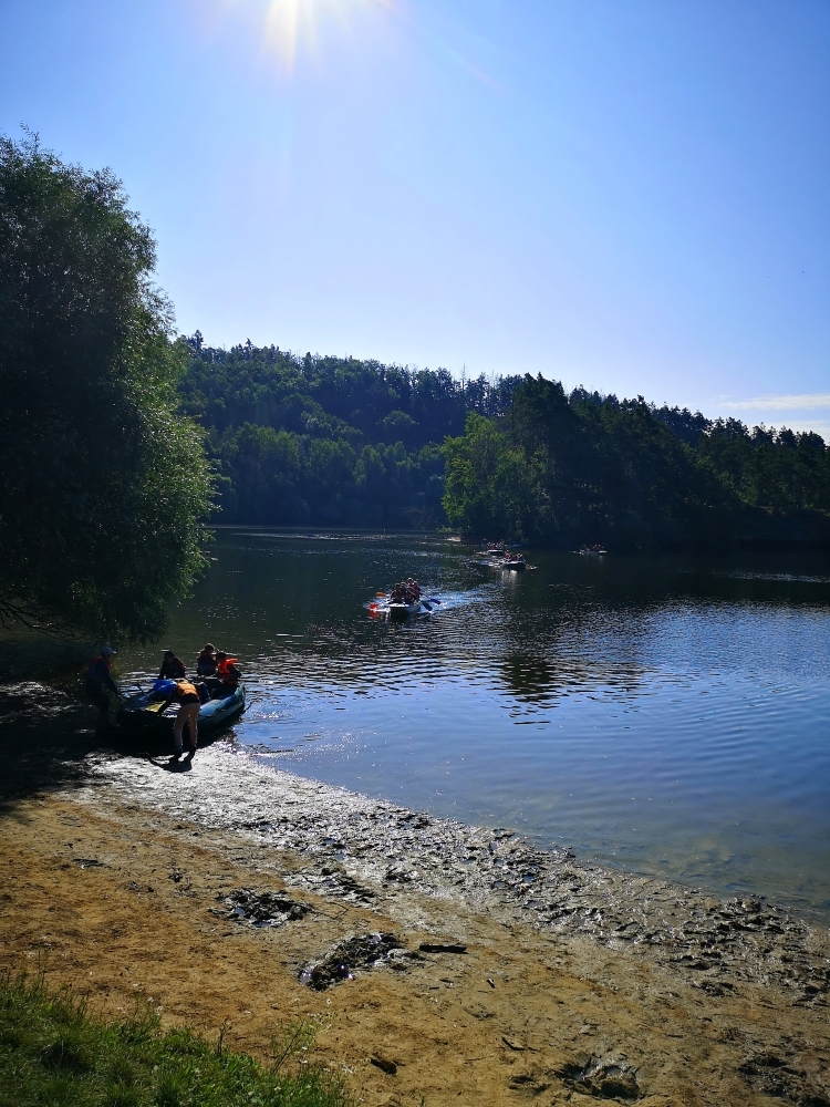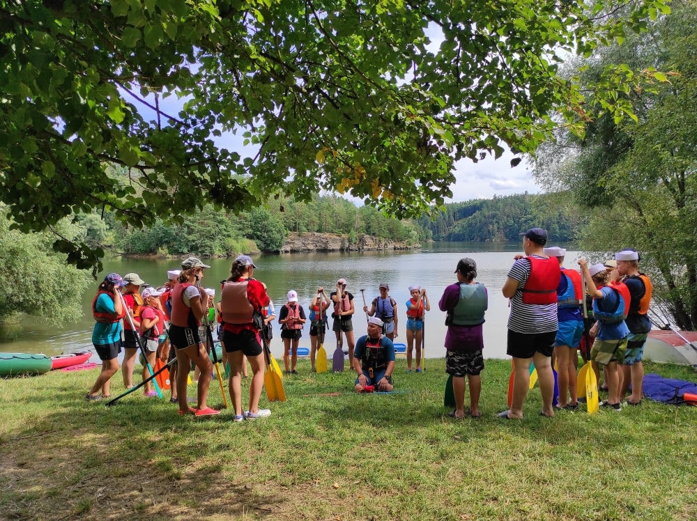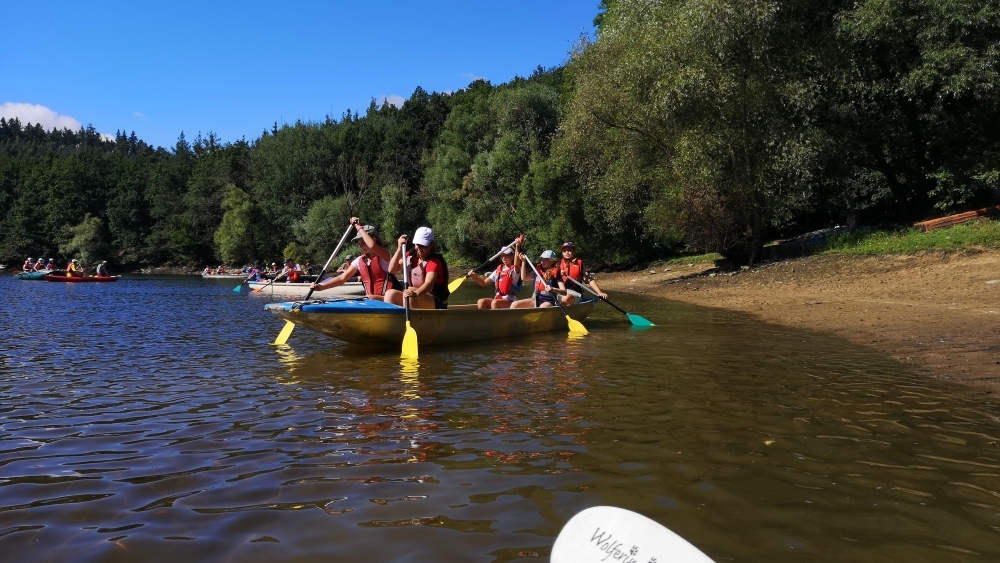 Letos nás nečekal jen jeden tábor, ale hned dva, souběžně běžící. Vodácký se konal na Dalešické přehradě. Tento tábor byl určený hlavně starším dětem. Čekalo nás nové neprozkoumané tábořiště, se kterým jsme se prvních pár dnů seznamovali stejně jako s ovládáním lodí. Děti byly rozděleny do tří flotil, z toho každá měla dva kormidelníky. Čili každá flotila měla dvě lodě a dvě posádky. Měli jsme tedy celkem šest lodí a na dalších pluli naši obratní vedoucí.