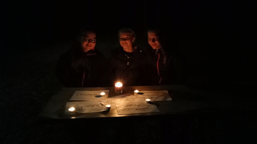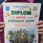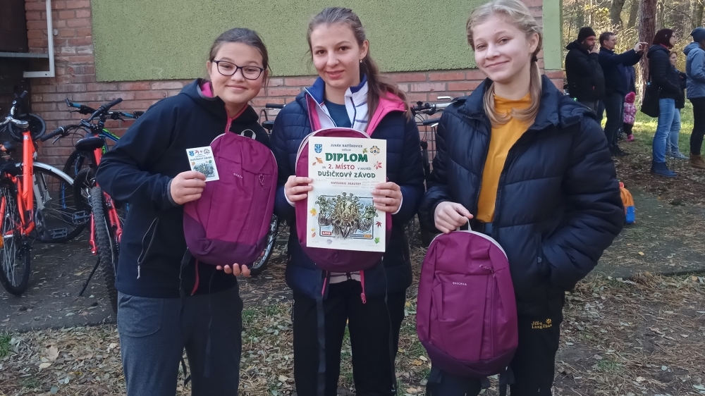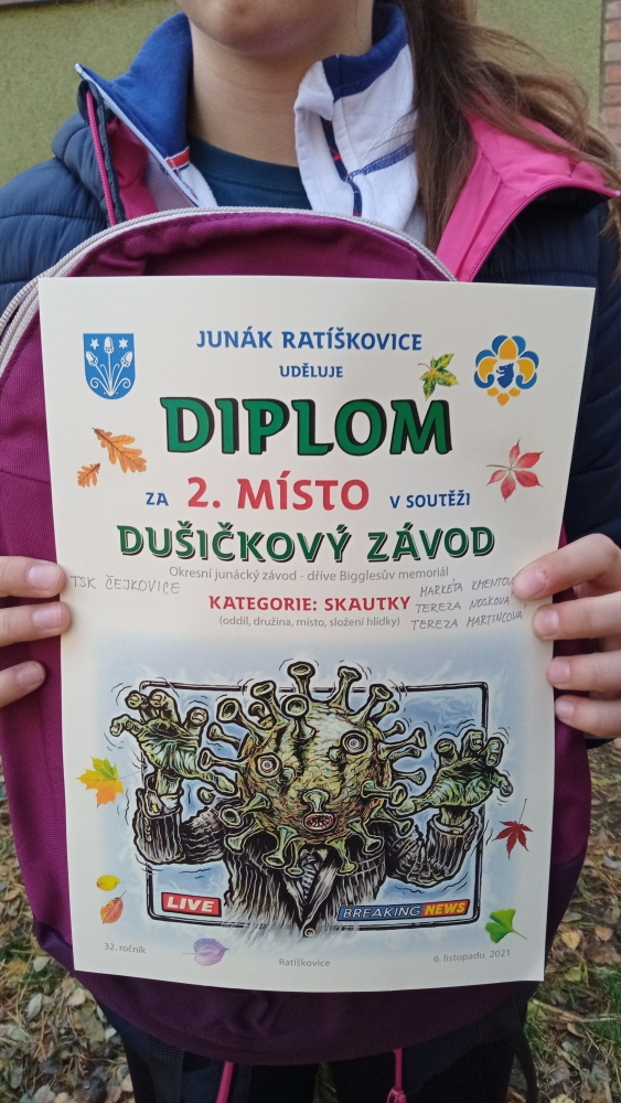 Dne 5.11 jsme se vydaly do Ratíškovic na dušičkový závod který se letos konal už po dvaatřicáté na počest všech zemřelých skautů a skautek. Po příjezdu autobusem nás čekal ještě kousíček cesty ke skautské klubovně. Samozřejmě jsme byly všechny hladové, no, kdo by taky nebyl po tak náročné cestě? Pak jsme šly hrát hru do lesa, ve které jsme musely najít duše (svíčky, kterými jsme si následně svítily na cestu při dalším hledání). U toho jsme našly různé svátky, které se slaví po světě na počest mrtvých a zjistili jsme jak se slaví. Ráno po snídani jsme udělaly s holkami oheň. A pak už se šlo závodit. Na stanovištích byly uzly, topografie, střelba, atd… Skoro u konce jsme měli jít skrz kukuřici a následně vyjít u lesa, jenže holky slyšely dupot a myslely si, že to byli divočáci, tak byly trochu vystrašené, ale nakonec to byly koně. Po doběhnutí jsme si daly bagetu, kterou jsme si připravovaly večer. A i přes takové menší zdržení jsme si vybojovaly krásné 2. místo! (o první místo nás dělilo pouhých 30 sekund)