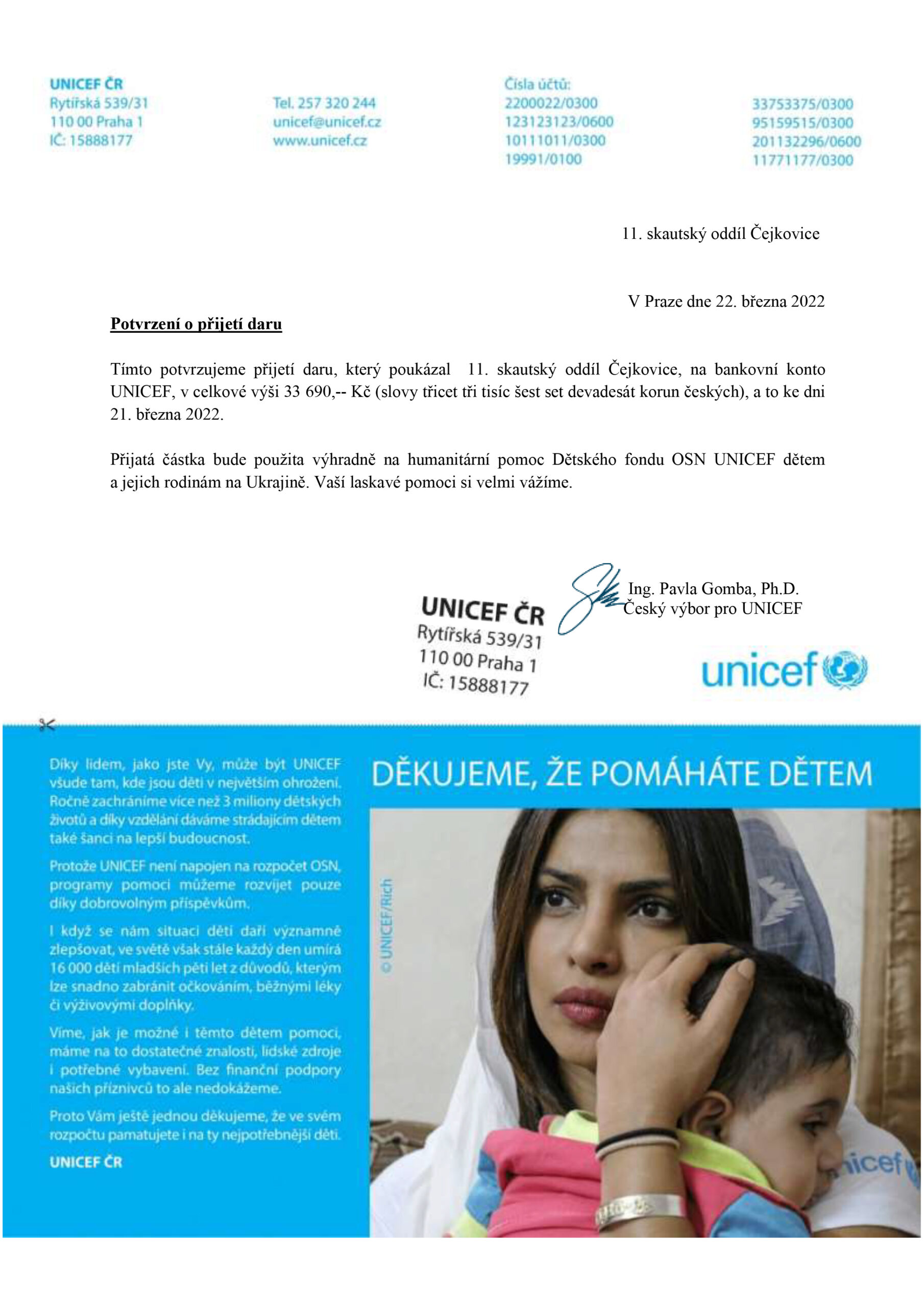 Cestu celé částky (na střediskový účet a z něj na účet OSN UNICEF) můžete sami sledovat na transparentním účtu našeho střediska