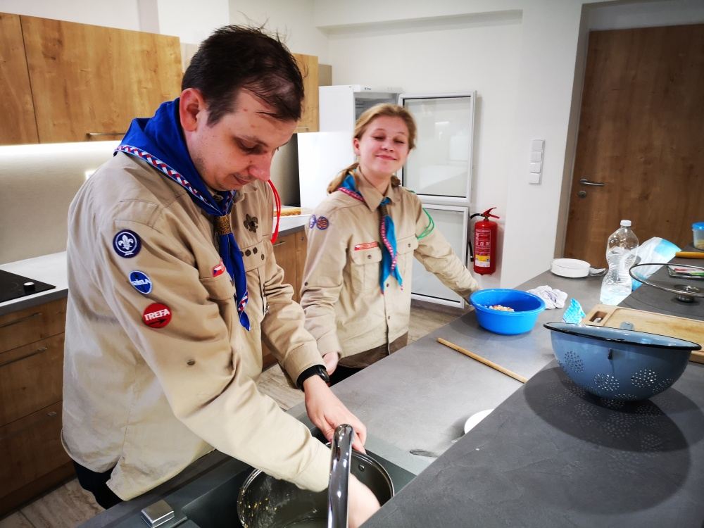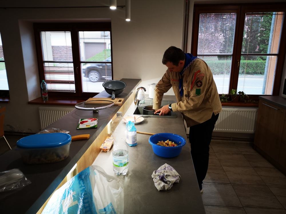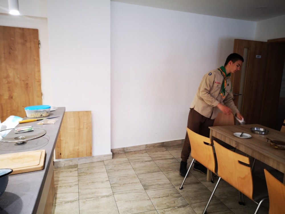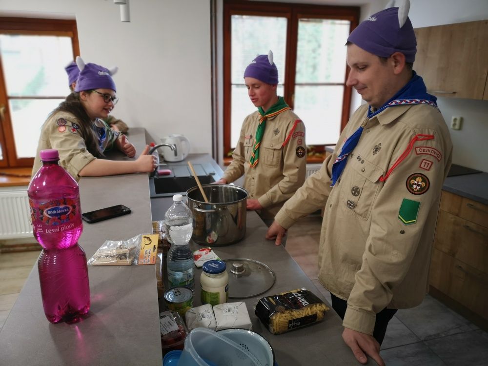 V sobotu 23.4. nás tedy čekala „stmelovačka“ na klubovně v Čejkovicích. Která byla určená hlavně pro tyto fantastické mladé vedoucí. Organizoval ji Marián a pojďme si tedy popsat co některé z vás může čekat při takové cestě, kterou tito mladí lidé jdou. Sraz byl v 16:00, to že někteří přišli pozdě ale vůbec nevadilo, protože zde zafungovala krásně komunikace a řádně dal každý vědět, kdy je mají organizátoři čekat. Začalo se malou stolní hrou, která se jmenuje: „Pukec“ ( najděte si video na internetu, je to sranda ) Při této stolní aktivitě se Marián ujal vaření pro všechny zúčastněné a nikdo kromě něj se vlastně nemusel o nic starat. Sníst specialitu šéfkuchaře ale už musel každý sám.