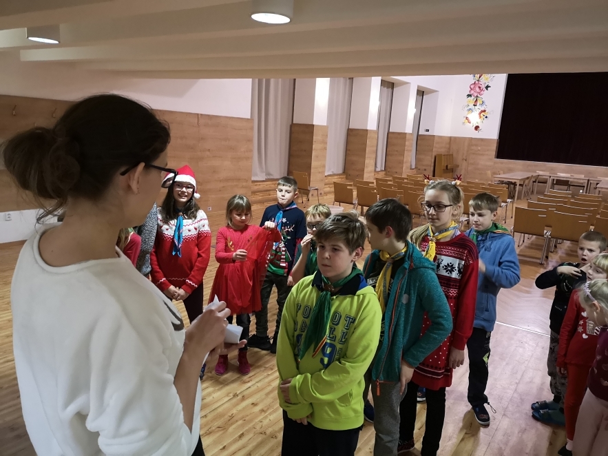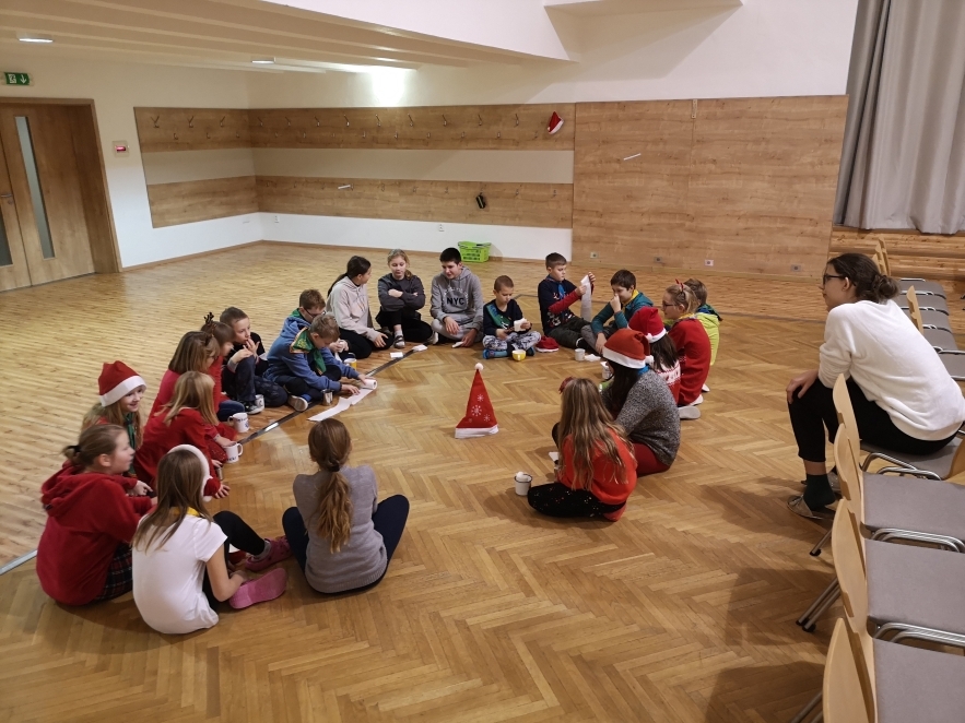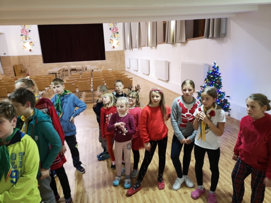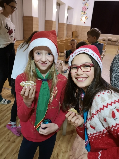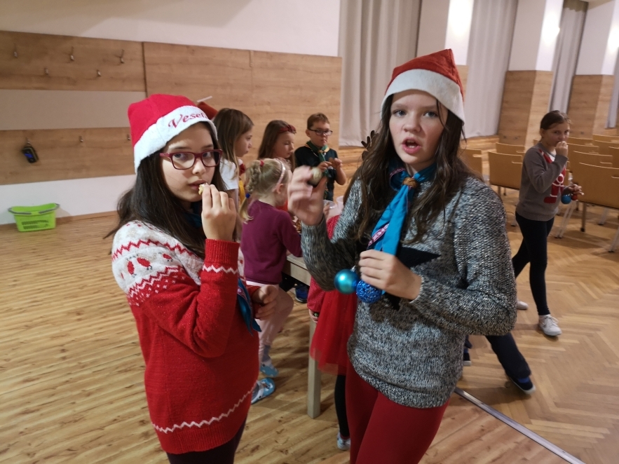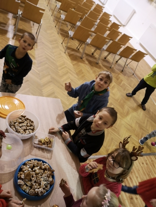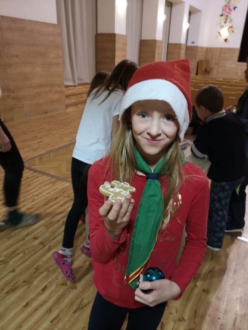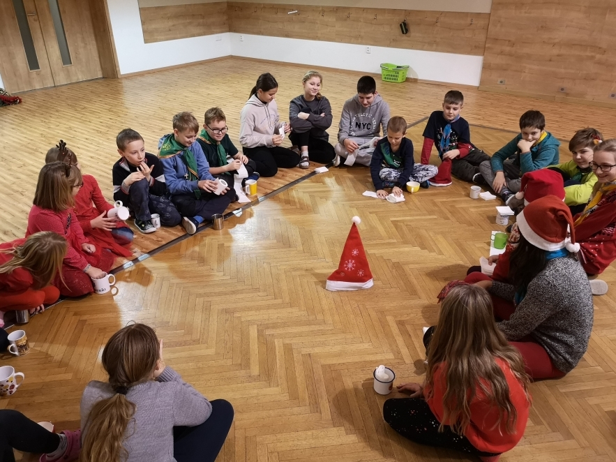 Nejprve proběhlo vzájemné seznámení s členy ostatních družin a poté už hráli koledy a došlo k první hře, kde se naše světlušky a vlčata naučili, jak to mají během svátků v jiných zemích. Například že v Itálii nosí dárky hodná čarodějnice Befana. Po této namáhavé aktivitě všem vyhládlo, proto jsme si dali pár perníčků a k tomu doušek dobrého kakaa.