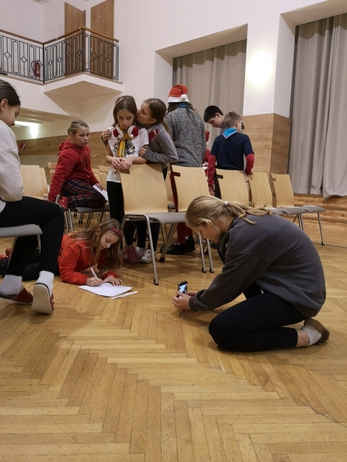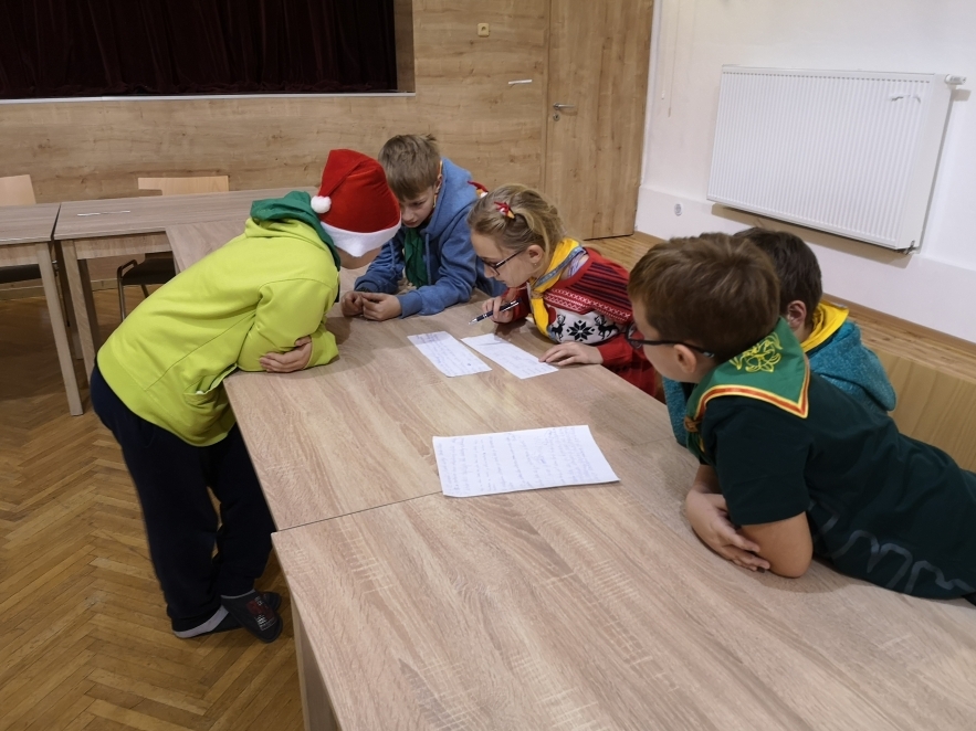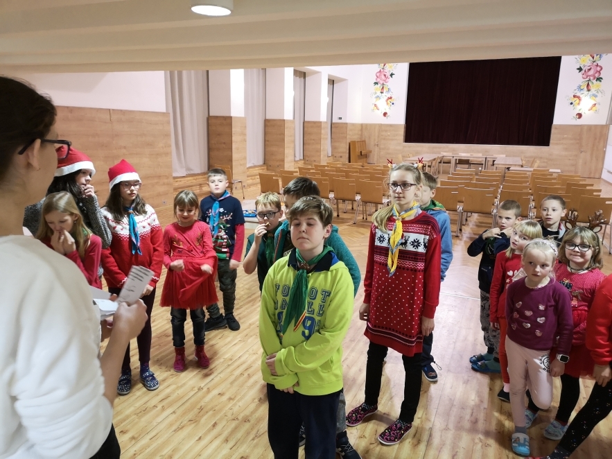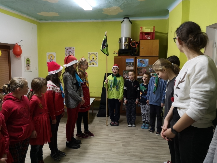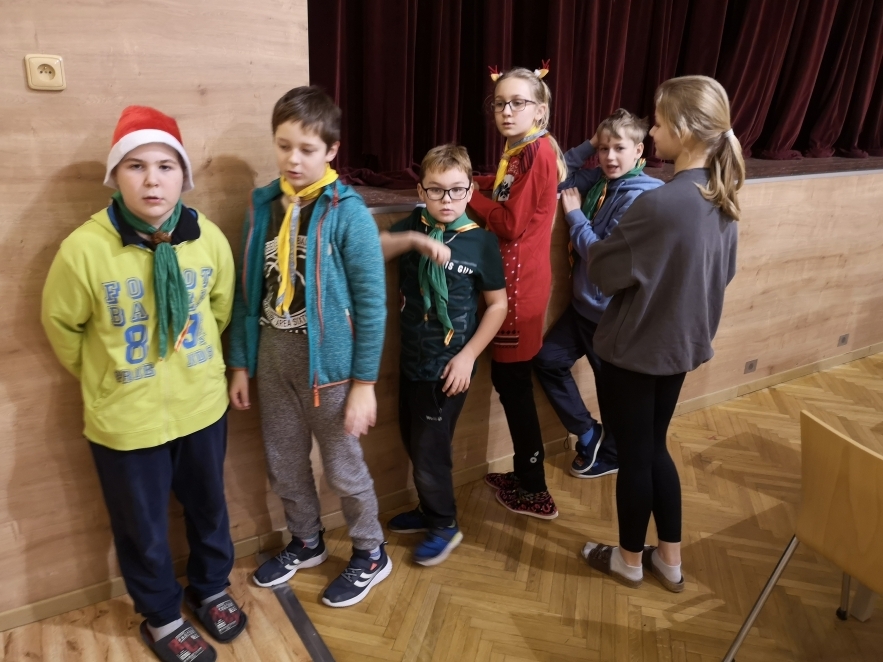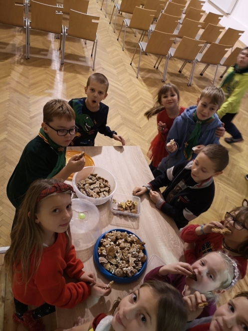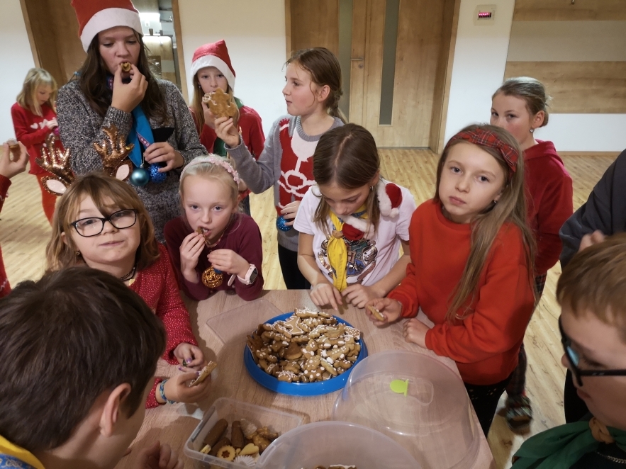 Nejprve proběhlo vzájemné seznámení s členy ostatních družin a poté už hráli koledy a došlo k první hře, kde se naše světlušky a vlčata naučili, jak to mají během svátků v jiných zemích. Například že v Itálii nosí dárky hodná čarodějnice Befana. Po této namáhavé aktivitě všem vyhládlo, proto jsme si dali pár perníčků a k tomu doušek dobrého kakaa.
